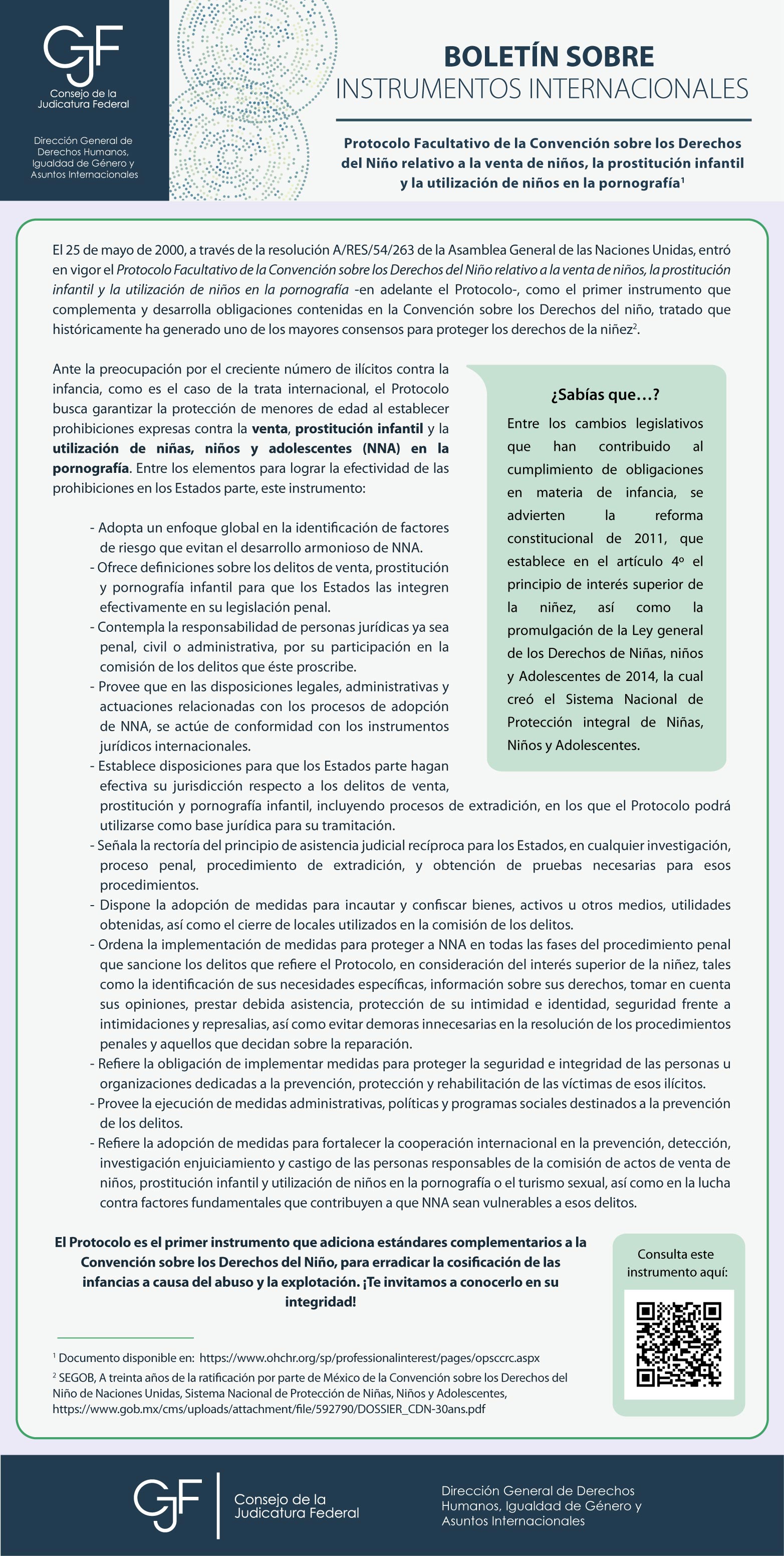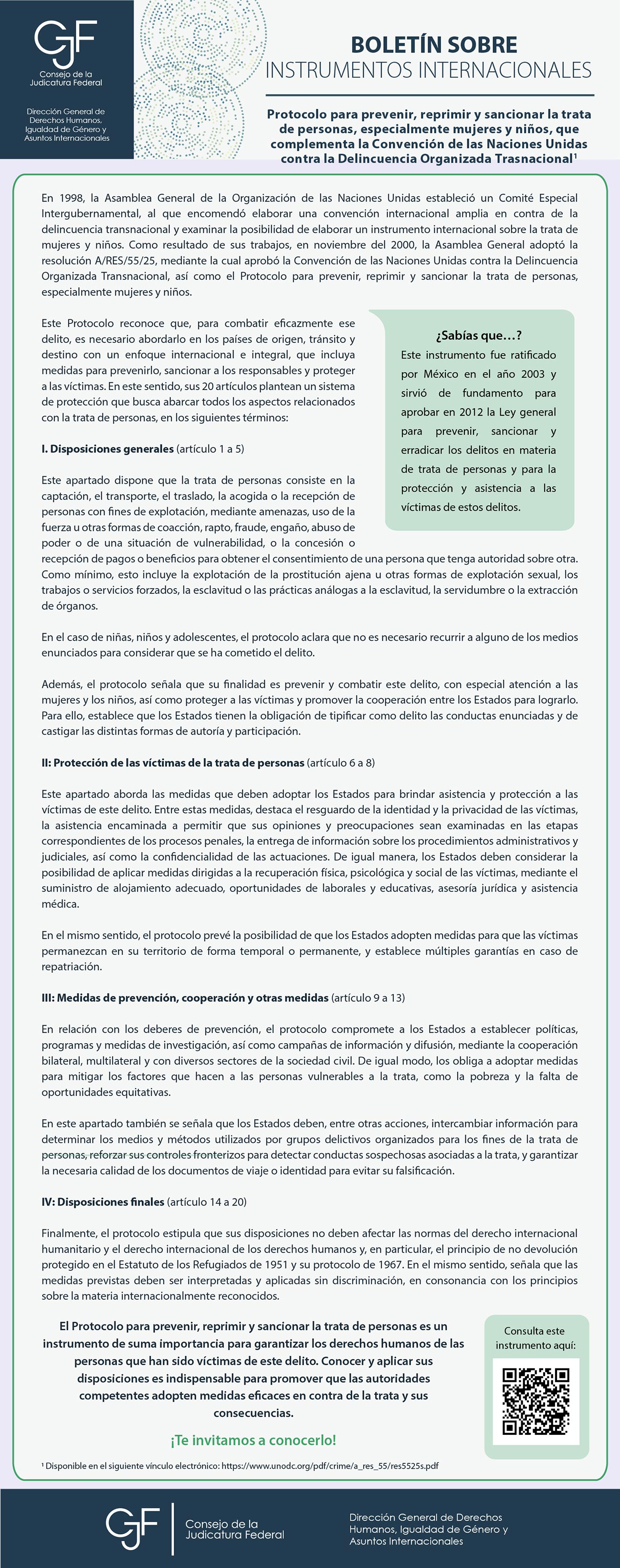 - Protocolo para prevenir, reprimir y sancionar la trata de personas, especialmente mujeres y niños, que complementa la Convención de las Naciones Unidas contra la Delincuencia Organizada Trasnacional