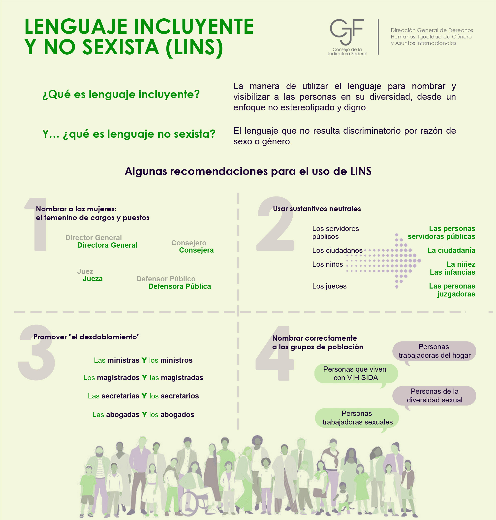 El 15 de septiembre de 2021 se publicó el Acuerdo del Pleno del Consejo de la Judicatura Federal por el que se autoriza el Catálogo General de Puestos, que autorizó la incorporación del lenguaje incluyente y no sexista en el Manual General de Puestos, con la finalidad de visibilizar de manera adecuada las profesiones y cargos desempeñados por mujeres y hombres en la institución. Con esto se establece un precedente y un compromiso para incorporar el LINS en el quehacer administrativo y jurisdiccional del Consejo.